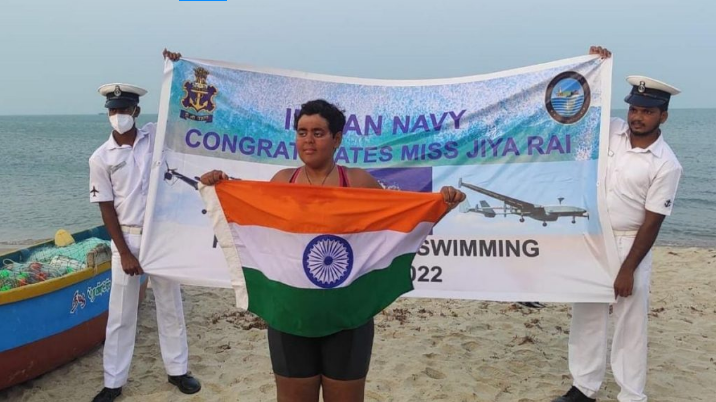 Miss Jiya Rai, daughter of a senior sailor of the Indian Navy, Madan Rai, MC-AT-ARMS II of INS Kunjali, and a student of Navy Children School, Mumbai, brought laurels to India by swimming across the Palk Strait from Talaimannar (Sri Lanka) to Dhanuskodi (India), a distance of 29 km, in 13 hours and 10 minutes on 20 March 2022. A child with Autism Spectrum Disorder, she achieved the feat at the age of 13 years and 10 months, becoming the youngest and fastest female swimmer in the world to swim across the Palk Strait. The record was earlier held by Ms Bula Chowdhary who swam the distance in 13 hours 52 minutes in 2004.