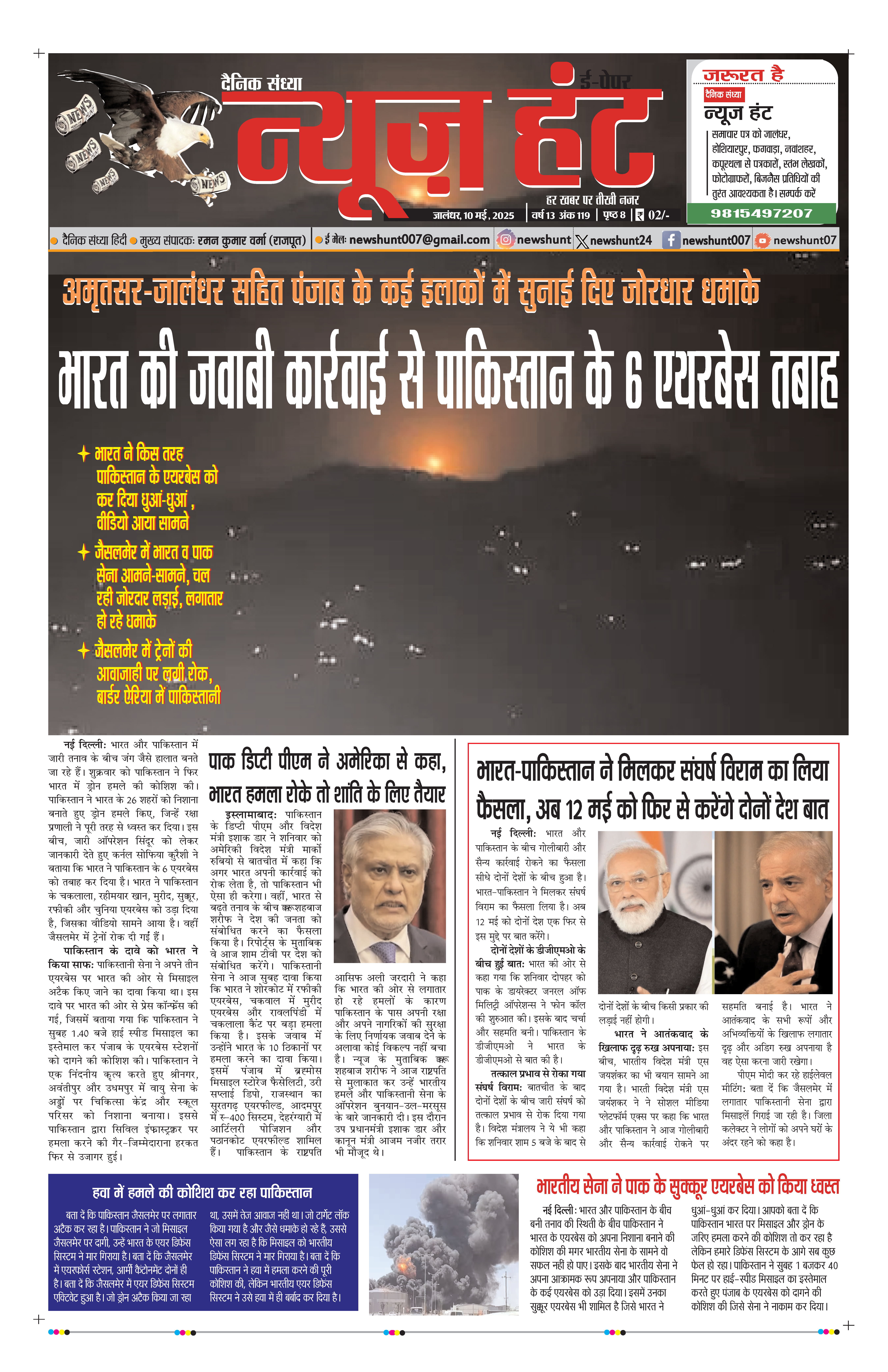HomeE-Paper E-Paper News Hunt Daily Evening E-Paper 10-05-2025 Page 1 By newshunt May 10, 2025 0 80 FacebookTwitterPinterestWhatsAppTelegramCopy URL Tags#breakingnews#newshuntlatestnews Share FacebookTwitterPinterestWhatsAppTelegramCopy URL Previous articleNews Hunt Daily Evening E-Paper 10-05-2025 Page 2Next articleपाकिस्तान ने फिर किया हमला तोडा Ceasefire newshunthttp://newshunt.info Related Articles E-Paper News Hunt Daily Evening E-paper 24-01-2026 Page 1 E-Paper News Hunt Daily Evening E-paper 24-01-2026 Page 2 E-Paper News Hunt Daily Evening E-paper 24-01-2026 Page 3 LEAVE A REPLY Cancel reply Comment: Please enter your comment! Name:* Please enter your name here Email:* You have entered an incorrect email address! Please enter your email address here Website: Save my name, email, and website in this browser for the next time I comment. Stay Connected0FansLike3,912FollowersFollow22,800SubscribersSubscribe - Advertisement - Latest Articles E-Paper News Hunt Daily Evening E-paper 24-01-2026 Page 1 E-Paper News Hunt Daily Evening E-paper 24-01-2026 Page 2 E-Paper News Hunt Daily Evening E-paper 24-01-2026 Page 3 E-Paper News Hunt Daily Evening E-paper 24-01-2026 Page 4 E-Paper News Hunt Daily Evening E-paper 24-01-2026 Page 5 Load more